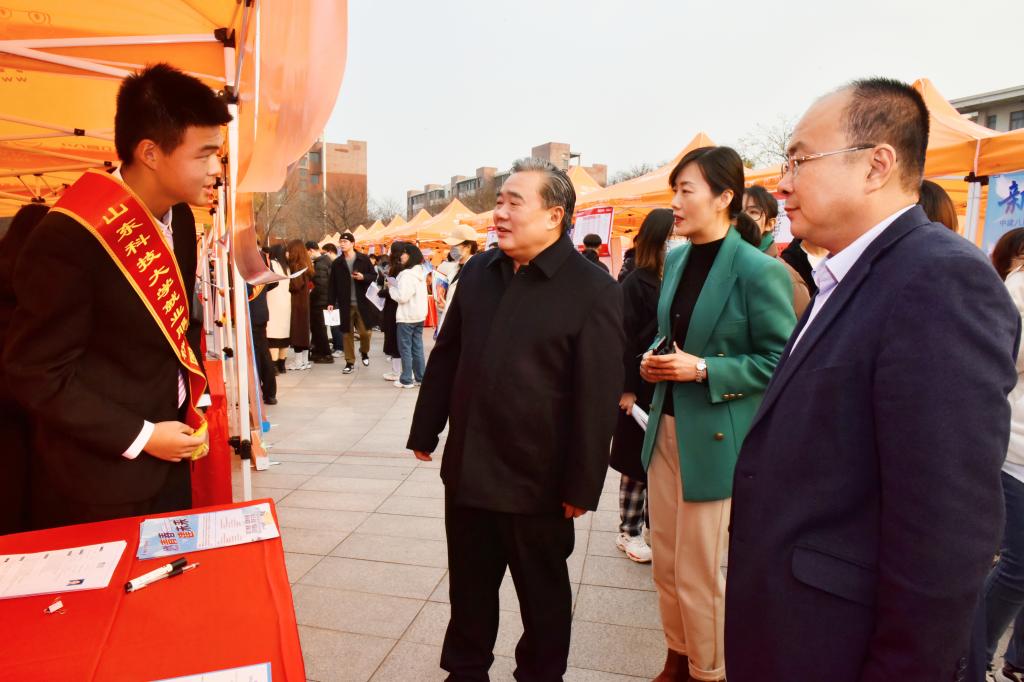 “八方来校招贤纳士,四海资源齐聚一堂”,在疫情防控常态化的今天,这般人山人海、现场交流的线下招聘会已非寻常。11月16日,在乐鱼线上平台(集团)官方网站青岛校区举办的“就选山东”山东省2021年高校毕业生集中招聘活动暨乐鱼线上平台(集团)官方网站“大使代言,助你就业”秋冬校园双选会上,应届毕业生却在感兴趣的企业展位前排起了长队,与招聘单位面对面谈得起劲。仔细一看,进行企业宣介并代收求职简历的不是招聘单位,而是受企业委托的“校园大使”;滚动播放的企业宣传视频中不乏科大年轻校友的身影;现场宣讲就业相关政策、为毕业生解疑释难的是电子大屏,实时连线的是相关地市人社局;直播间里,山东港口集团等六家知名企业开展远程“职”播带岗,与毕业生直接沟通,推介企业岗位……“大使代言,助你就业”招聘大集就这样火热开市。校长姚庆国,校党委常委、宣传部部长李克周及相关职能部门负责人到招聘会现场调研就业情况,亲自体验扫码、观看直播等活动,与提前来求职的毕业生们亲切交流。