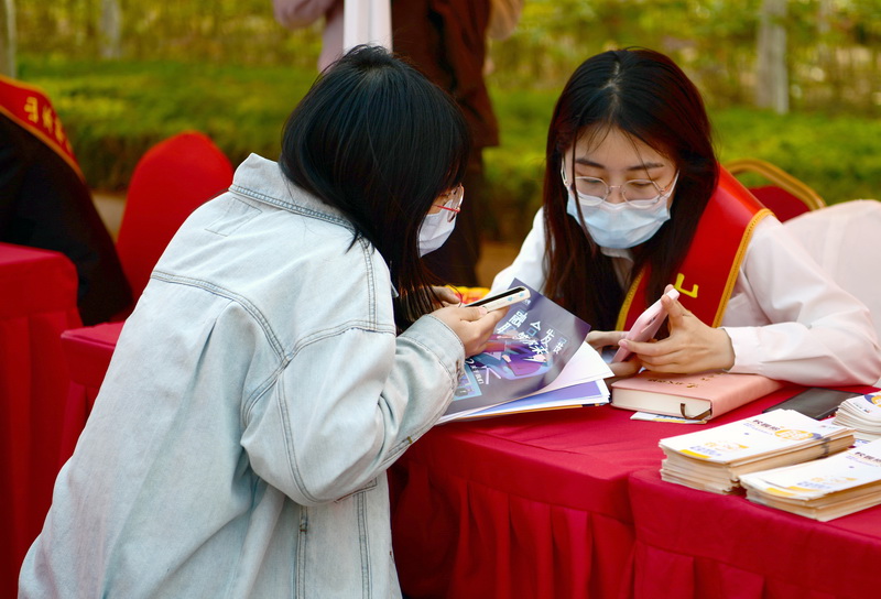 “校园就业大使”向同学介绍企业招聘信息(许浩/摄)