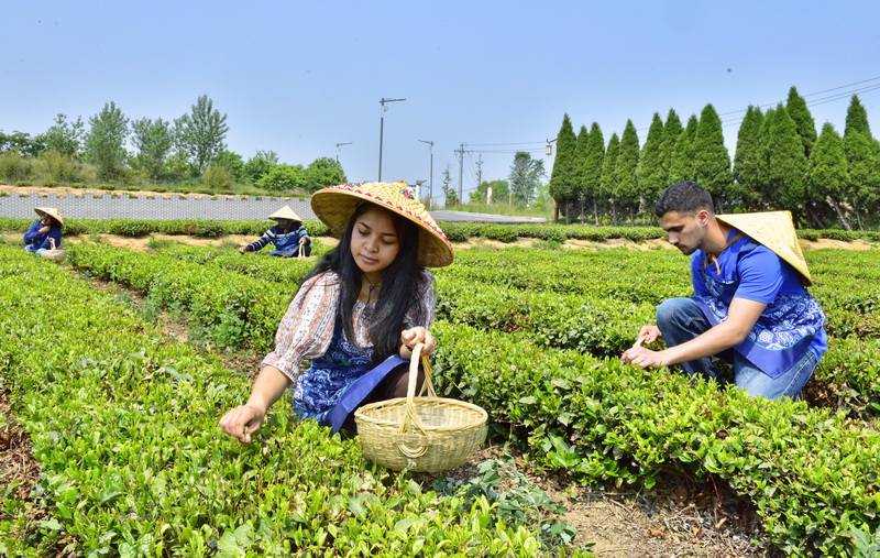 留学生在采摘新茶