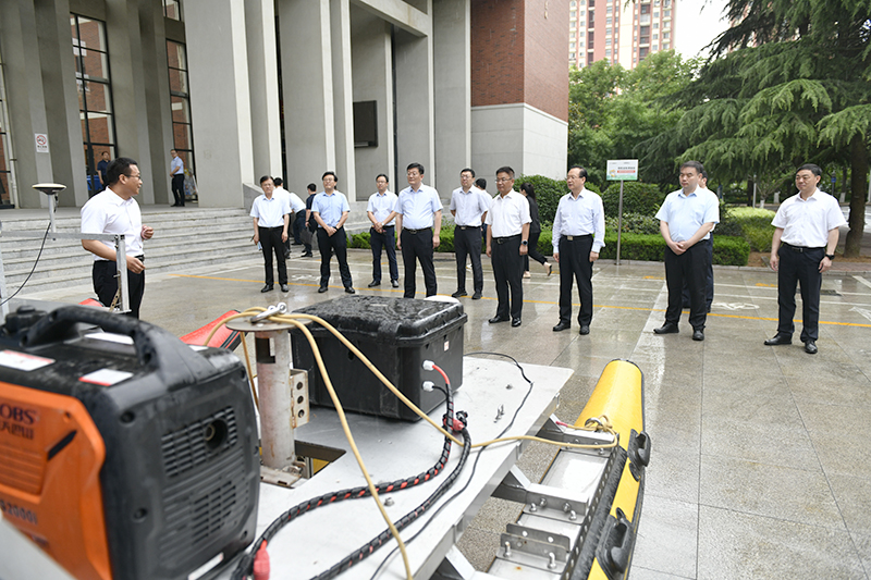 调研过程中,孙海生一行先后来到校史馆、国家大学科技园、矿山安全检测技术与自动化装备国家地方联合工程研究中心、煤矿安全开采国家虚拟仿真中心、省部共建矿山岩层智能控制与绿色开采国家重点实验室培育基地等处,实地察看学校科研平台建设环境及实验室运行情况,详细了解学校在科技创新、成果转化、产教融合、科研团队建设等方面的工作进展及特色成果。