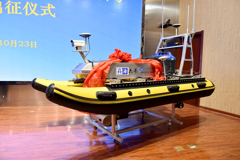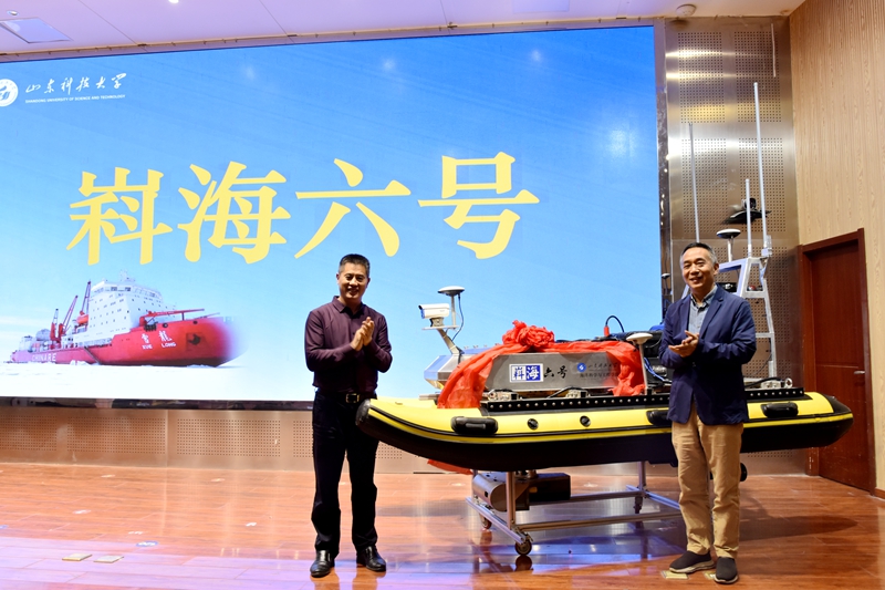 出征仪式上,一段极地无人船研制纪实视频带领大家走近了海洋学院自主研制的极地无人船。北京星天科技有限公司、广州南方测绘科技股份有限公司向海洋学院捐助海洋科考设备,助力南极科考,随后,与会领导共同启航极地无人船“嵙海六号”。