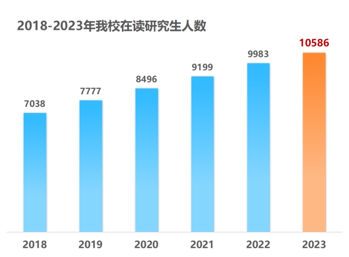 近日,记者从学校研究生院获悉,我校在读研究生总数已达到10586人(含国际研究生186人),其中硕士研究生9813人,博士研究生773人,学校研究生规模首次破万,较2018年学校研究生规模增长达50.4%。