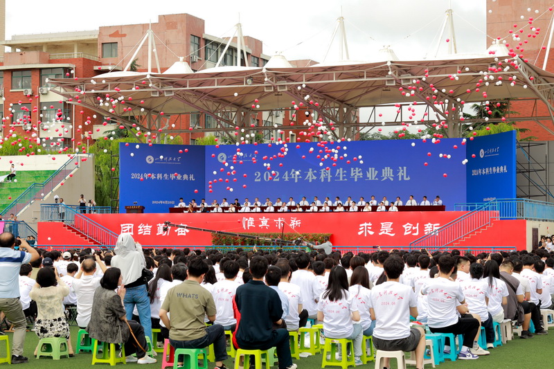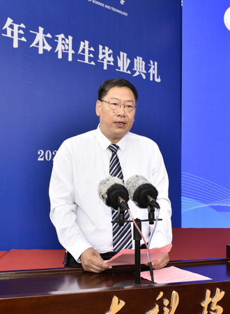 曾庆田代表学校向圆满完成学业的2024届全体本科毕业生表示热烈的祝贺和深情的祝福,向为此付出辛劳的老师、家长致以崇高的敬意和衷心的感谢。他深情回顾了同学们从入山科到驻山科再到出山科、念山科的成长历程,分享了优秀毕业生不平凡的青春追梦故事,他表示,四年的求学时光记载了同学们朝气蓬勃的青春风采,也承载了大家绚丽多彩的青春梦想,学校见证了同学们从青涩懵懂到坚定自信,看到了大家在青春赛道上奋力奔跑的模样,这些经历都将成为同学们人生路上宝贵的积淀。同学们即将重新起航,踏上新征程,希望同学们不负青春、不懈努力,在实践中淬炼,在拼搏中磨砺,努力成为“行稳致远”的奋进者、开拓者、奉献者。