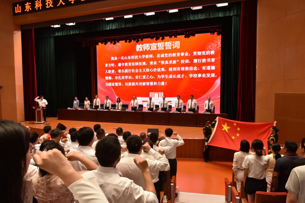 会议还举行了新教师宣誓、老教师重温教师誓词仪式。在青年教师代表刘震的带领下,全体教师面对国旗,举起右拳,立誓忠诚党的教育事业,做“四有”好老师,为学生成才、学校事业发展、国家繁荣、民族振兴贡献智慧和力量。