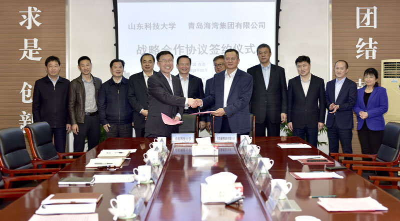 校党委书记罗公利、青岛海湾集团有限公司董事长李明等领导见证了协议的签订。副校长刘新民、集团公司副总经理张英民代表双方在协议书上签字。