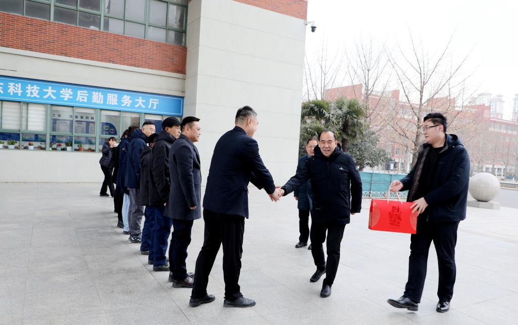 曾庆田先后来到南门值班室、东侧科创中心工地、教学楼值班室、应急指挥中心、留学生公寓、中心变电站、中心换热站、校医院、山海花园大门值班室等看望慰问在岗职工。每到一处,曾庆田都热情地与在岗职工一一握手,详细了解春节期间值班部署等工作情况,并为在岗职工代表送去感谢和节日祝福。他对大家在节日期间坚守岗位、无私奉献的精神给予充分肯定。叮嘱大家要提高政治站位,强化风险意识,保障节日期间各项工作有序运转,确保留校师生过一个欢乐祥和平安的春节。