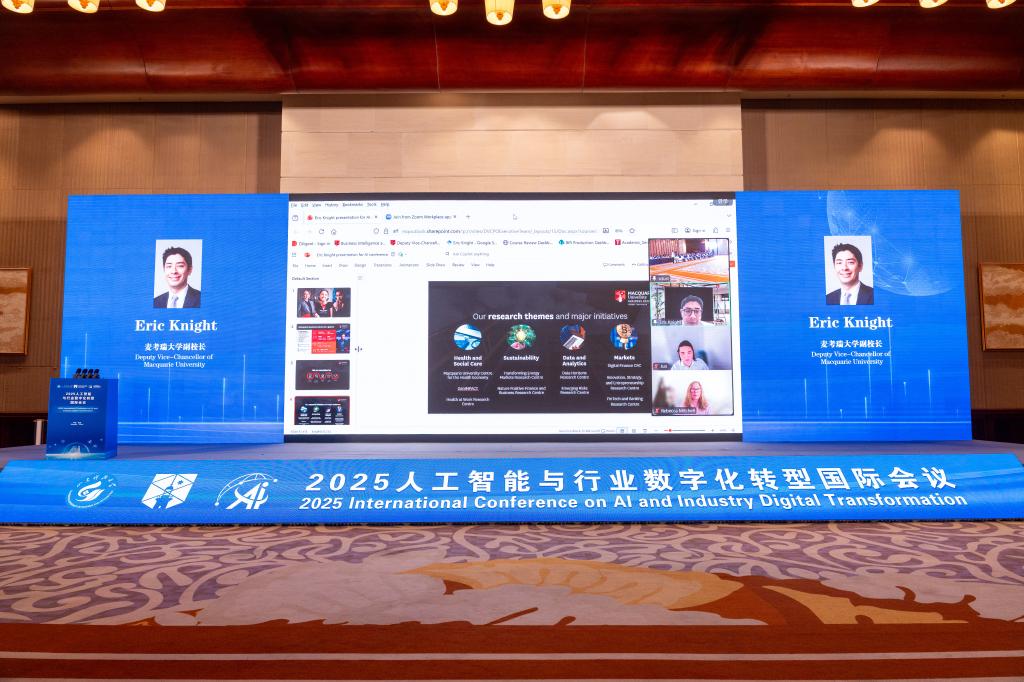 Eric Knight介绍了麦考瑞大学在人工智能领域构建的跨学科创新生态。他通过健康医疗、环境保护、智慧交通、金融服务等领域的案例,阐释了人工智能前沿理论与产业实践的深度融合。他希望通过本次会议,与各方通力协作,共同开拓人工智能研究的广阔前景。