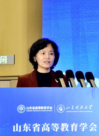 山东省高等教育学会秘书长、潍坊学院校长王霞代表山东省高等教育学会宣读《关于同意成立山东省高等教育学会人才工作分会的函》。