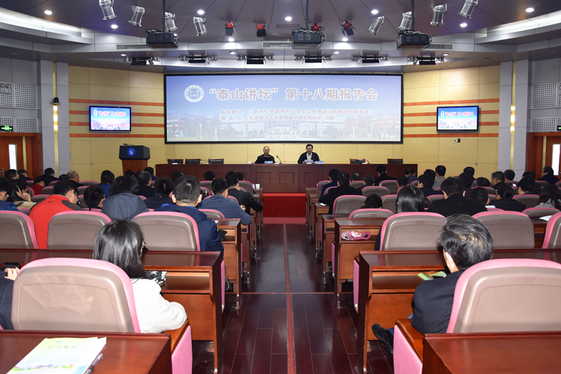 3月20日,学校举办“泰山讲坛”第十八期报告会,特邀北京师范大学思想政治研究院院长冯刚教授来校作“习近平新时代中国特色社会主义思想政治教育的创新发展”专题报告。报告会由校党委副书记尹华主持,副校长高建广出席报告会。