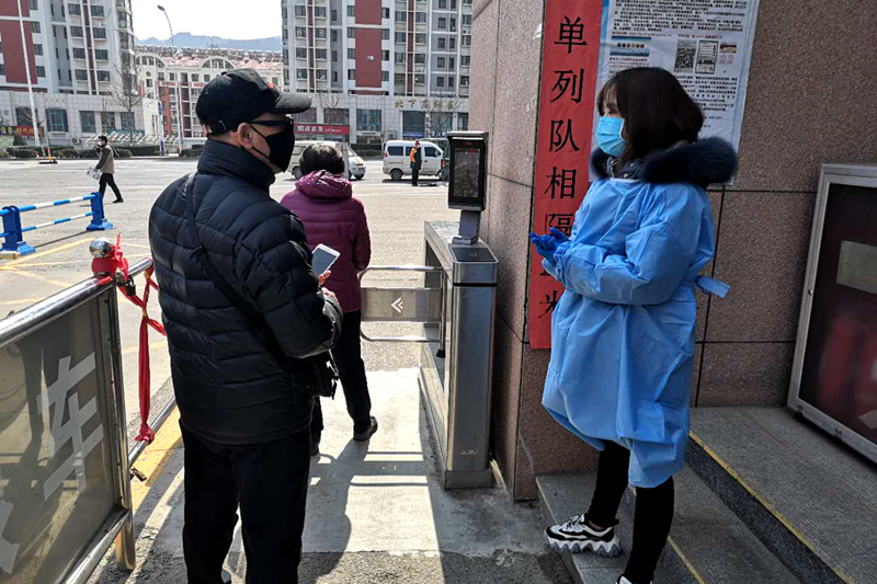 从下午5点到晚上10点,马赫跟同事们在山海花园门口值班。5点到8点,正值教职工及家属上下班时间,来往车辆较多,值班人员需要核对进出人员身份,并对进入人员进行体温测量、消毒、登记,他们对每个环节都严格落实并熟练进行,进出人员井然有序。