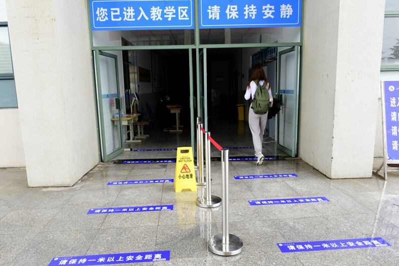 同学们严格按照一米线间隔要求排队进入教学区