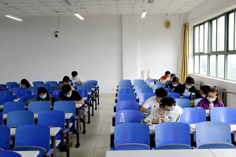 同学们在阶梯教室严格按照要求戴口罩、间隔就座