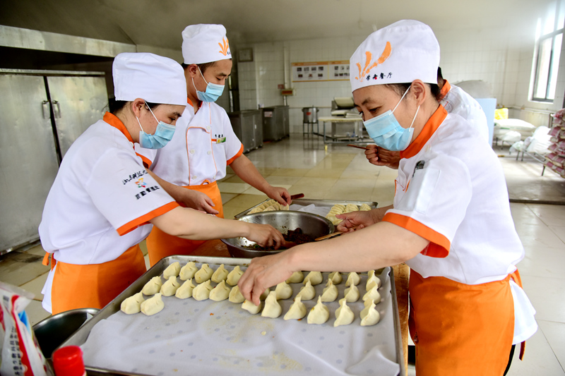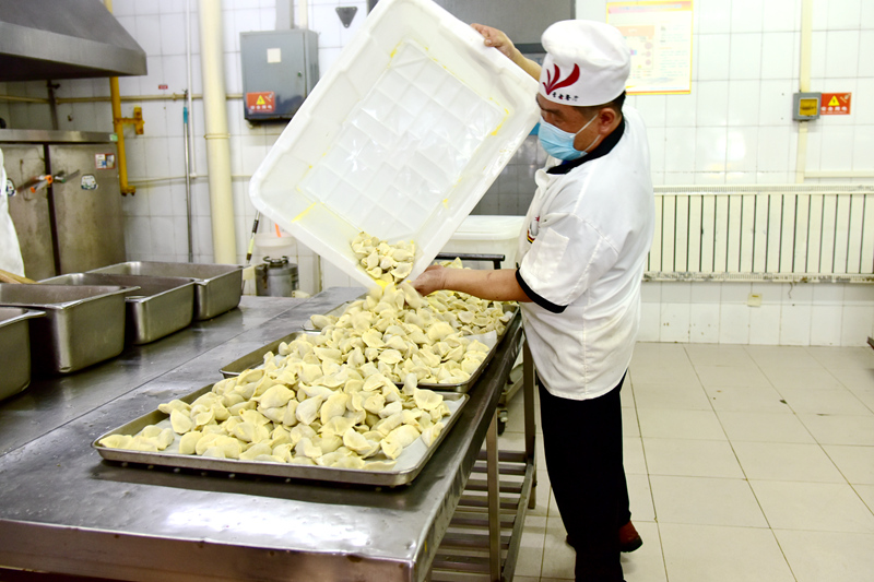 后勤人员加班加点为学生包水饺(范琪/摄)