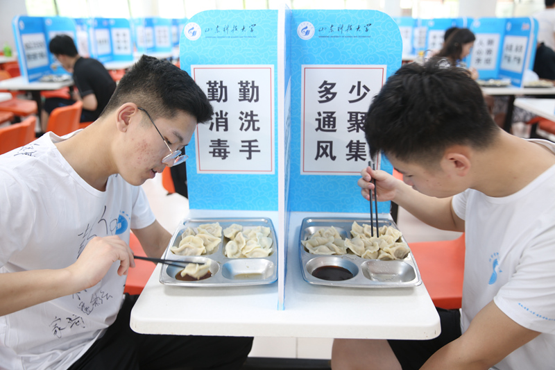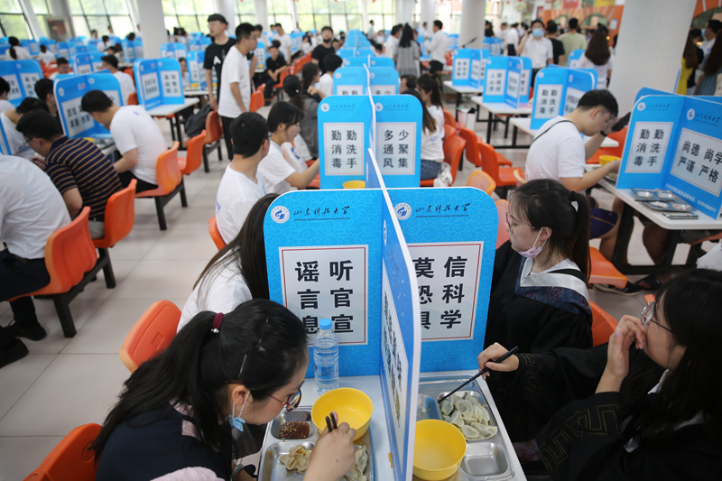 在餐厅,“浓情饺子宴 别样毕业寄”的横幅分外显眼,一盆盆热气腾腾的水饺由工作人员发放给同学们,饺子汤、醋、纸巾等一一备齐,处处体现出学校的周到和细致。学校严格落实疫情防控要求,每张餐桌用十字隔断划分,同学们在自己的就餐区域就餐,虽然没有举杯推盏的热闹场面,但一份份热气腾腾的饺子温暖了同学们的心。