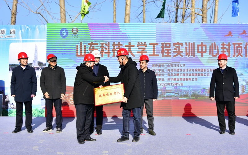 12月17日,晴空万里,阳光明媚,乐鱼线上平台(集团)官方网站迎来了一件大喜事:学校工程实训中心项目主体顺利封顶。校长姚庆国,副校长张英杰、曾庆田和学校相关部门负责人及参建单位代表共同启动工程实训中心项目封顶,姚庆国为荣华建设集团乐鱼线上平台(集团)官方网站工程实训中心项目部颁发“优秀项目团队”匾牌。