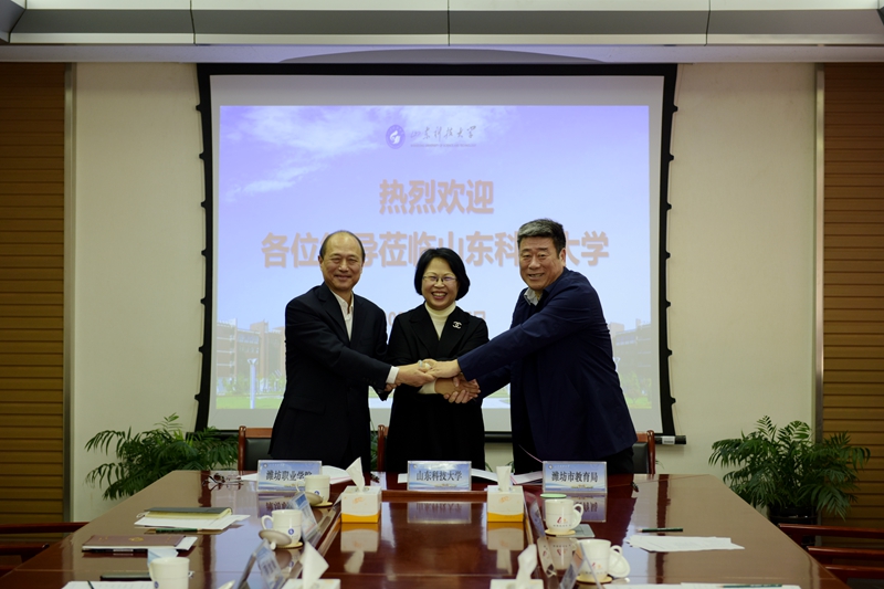 3月17日,乐鱼线上平台(集团)官方网站与潍坊市教育局、潍坊职业学院合作签约仪式在我校举行。签约仪式前,校党委书记罗公利、校长姚庆国会见客人一行。乐鱼线上平台(集团)官方网站副校长李玉霞与潍坊市教育局副局长李广敬、潍坊职业学院党委书记马跃启分别代表三方签约,共同开启三方在学科专业合作建设、研究生联合培养等方面合作之旅。