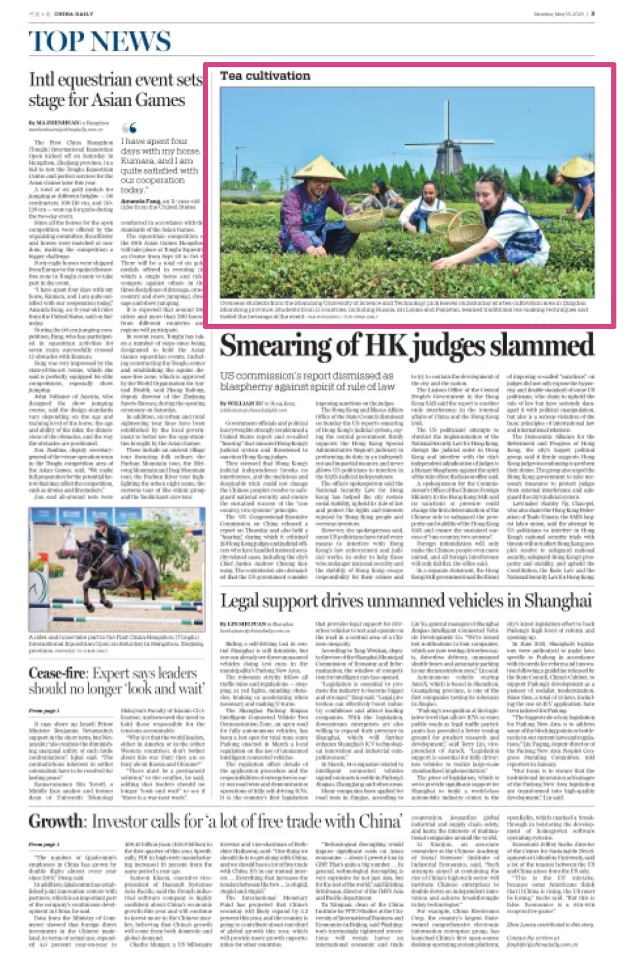 Overseas students from the Shandong University of Science and Technology pick leaves on Saturday at a tea cultivation area in Qingdao, Shandong province. Students from 11 countries, including Russia, Sri Lanka and Pakistan, learned traditional tea-making techniques and tasted the beverage at the event.