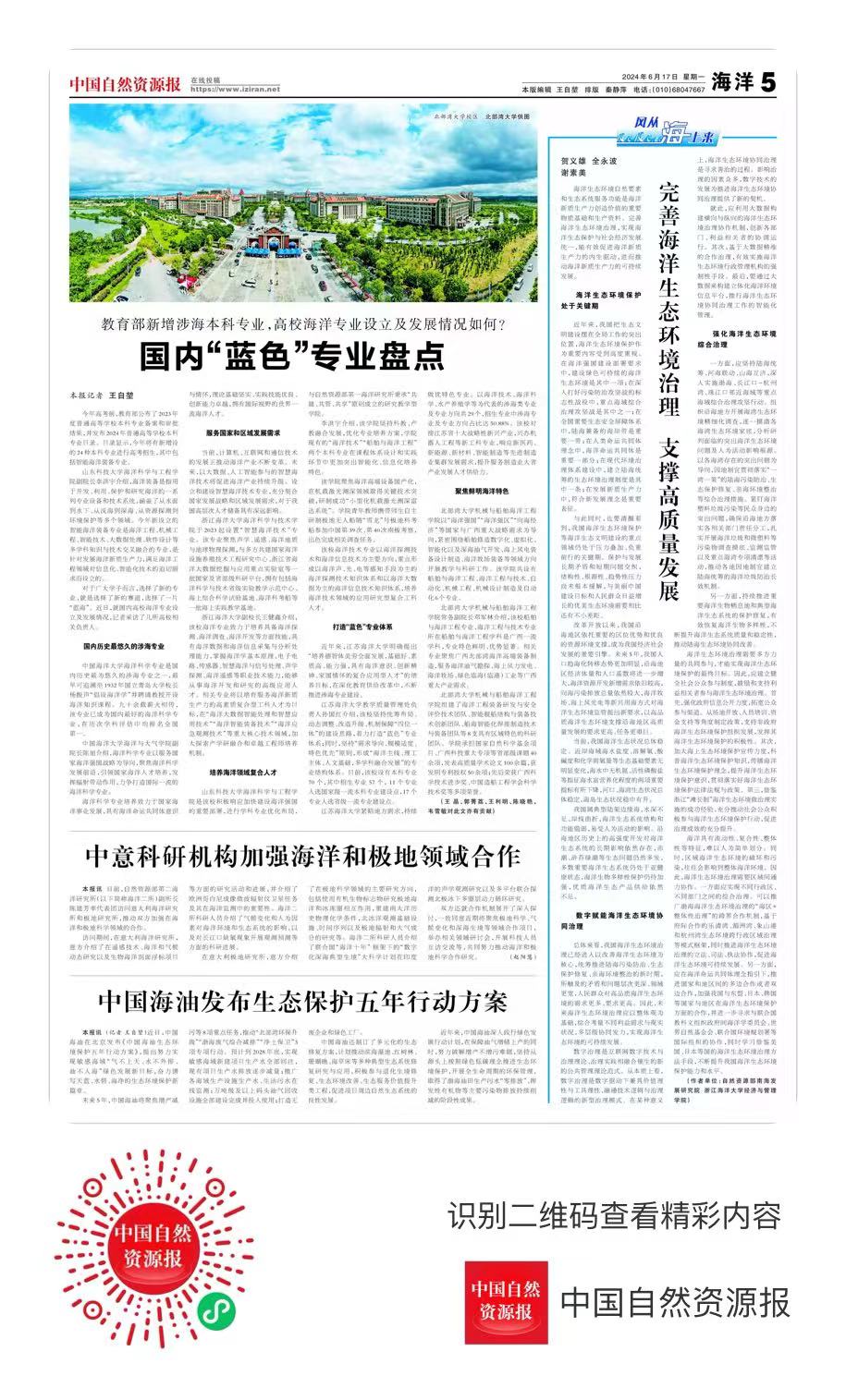 浙江海洋大学副校长王健鑫介绍,该校海洋专业致力于培养具备海洋探测、海洋调查、海洋开发等方面技能,具有海洋数据和海洋信息采集与分析处理能力,掌握海洋学基本原理、电子电路、传感器、智慧海洋与信号处理、声学探测、海洋遥感等职业技术能力,能够从事海洋开发和研究的高级应用人才。相关专业将以培育服务海洋新质生产力的高素质复合型工科人才为目标,在“海洋大数据智能处理和智慧应用技术”“海洋智能装备技术”“海洋应急观测技术”等重大核心技术领域,加大探索产学研融合和卓越工程师培养机制。