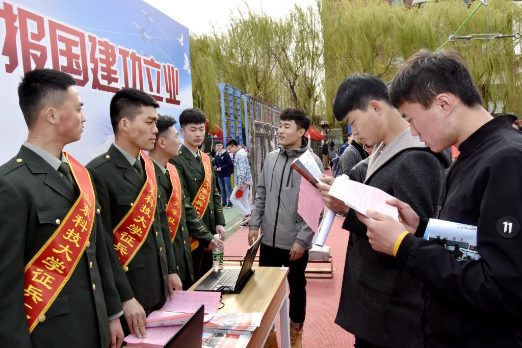 在春季招聘会上,退伍学生介绍征兵政策