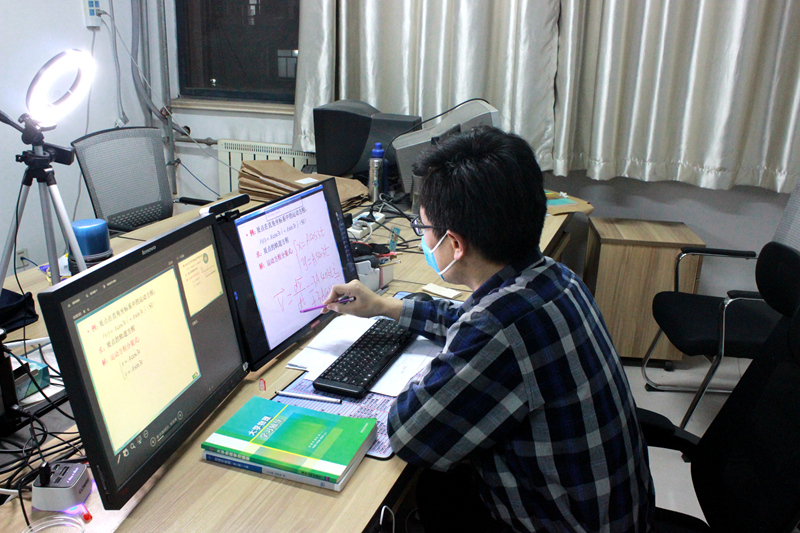 疫情突然来袭和学校延期开学,“停课不停教、停课不停学”的重任落在了教师身上。对于绝大多数教师而言,以前从没有过线上教学的经验。教学模式的被迫突然转变让人措手不及,教师们开始迅速应变。据介绍,大学物理课程是全校性的公共基础课程,涉及学生多,课程覆盖面广。为了上好疫情防控中特殊的“开学第一课”,教学团队迅速成立备课组、技术组、联络组,专人负责,全系发动,制定了详细工作方案,积极与教务处和各个学院教学联动,保证在线课堂顺利开课。为了让特殊时期第一课更有意义,大学物理教学团队集体备课、课程负责人梁敏老师将开课前期任务细化分解,明确了每位教师的任务和工作计划,从课程预习、授课到课后作业发放、答疑反馈的一系列教学环节都做好明确的安排。技术组李照鑫、王鹏老师准备了多套直播预案,并迅速解决了直播过程中的技术问题;刘静、李鹏老师负责教学资源的整理和发放工作;所有任课教师利用超星学习通平台建立班级群或QQ、微信群,确保将开课通知提前发送到每一位学生……