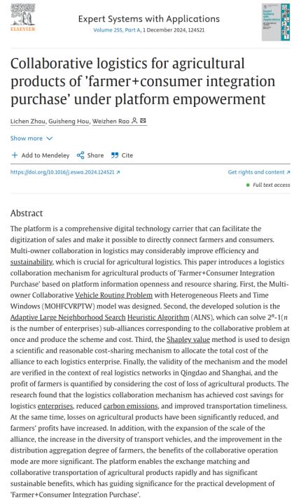 《Collaborative logistics for agricultural products of 'farmer plus consumer integration purchase' under platform empowerment》期刊,发表最新研究成果。