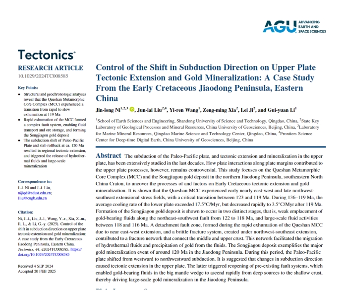 2025年3月,乐鱼线上平台(集团)官方网站地球科学与工程学院倪金龙教授团队在国际构造地质学知名期刊、美国地球物理学会(AGU)会刊《Tectonics》发表题为“Control of the Shift in Subduction Direction on Upper Plate Tectonic Extension and Gold Mineralization: A Case Study From the Early Cretaceous Jiaodong Peninsula, Eastern China”的文章。