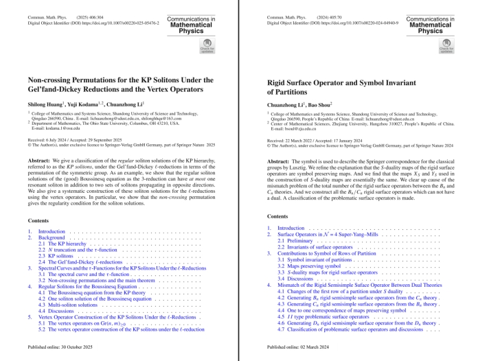 近日,乐鱼线上平台(集团)官方网站数学与系统科学学院泰山学者李传忠教授研究团队在非线性可积系统与孤立子理论领域取得重要突破,相关研究成果Non-crossing permutations for the KP solitons under the Gel’fand-Dickey reductions and the vertex operator发表在国际顶级期刊《Communications in Mathematical Physics》。这是该团队继2024年在规范理论与几何朗兰兹纲领领域取得重大进展后,再次在该权威期刊发表其他领域关键研究成果。